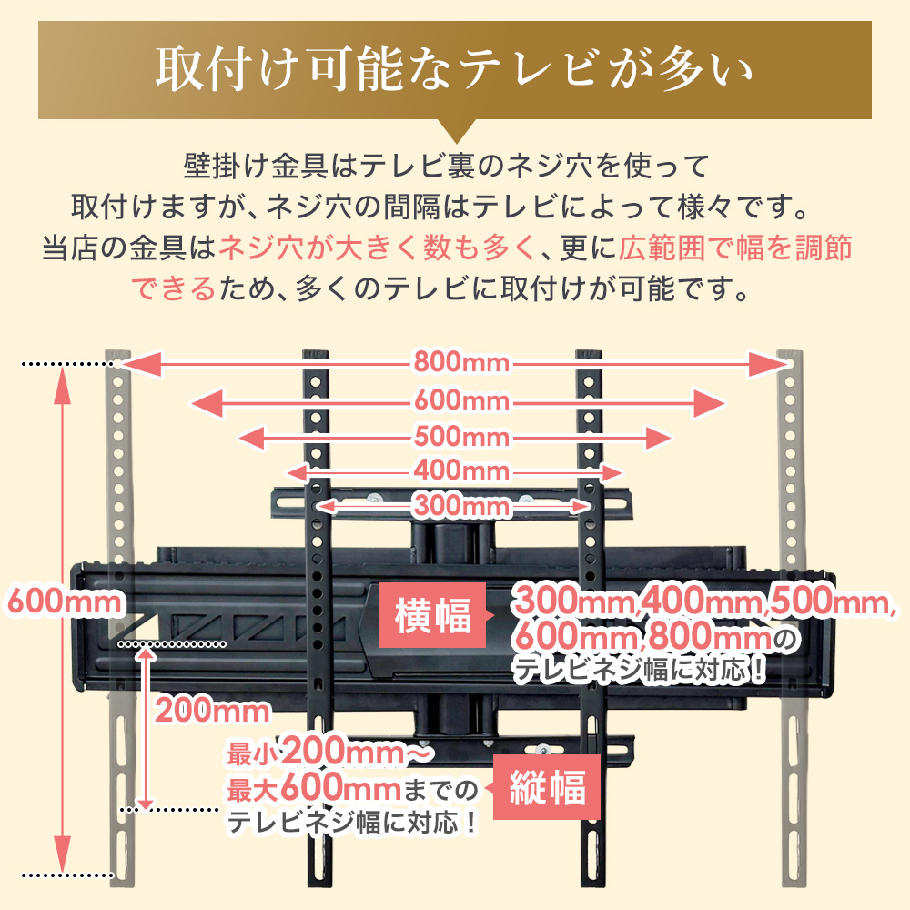 | 対応ネジ穴間隔 | 縦:200mm〜600mm 横:300・400・500・600・800mm |